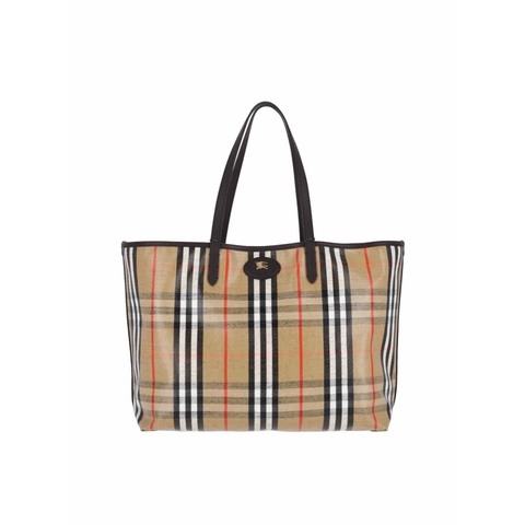 Burberry Ladies Tote. SKU: 8112222. Color: Sand. Size: A 37 x L 39 X P 17 cm. Burberry Highlands Medium Tote Bag. Burberry Highlands medium tote bag in viscose cotton and beige linen, calf leather trim, multicolor Check pattern, two handles, snap button strap closure, removable inner pouch, snap button flap closure detail, single inner compartment.. Composition: 69% Cotton, 21% Viscose, 10% Linen