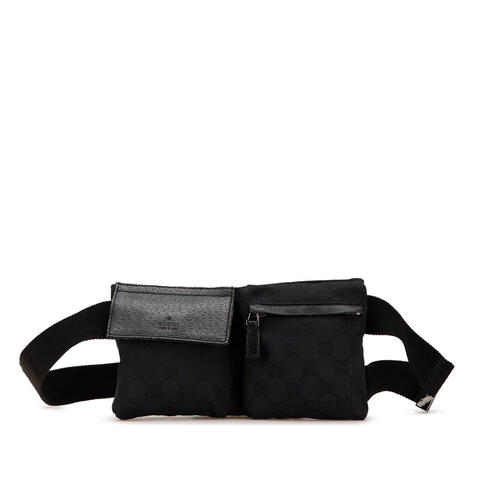 This belt bag features a canvas body with leather trim, an adjustable waist strap, front flap and zip closure pockets, and an exterior back zip pocket. Gucci Unisex Crossbody. SKU: 162962 497717. Color: Black. Size: 9 x5. Gucci - GG Canvas Double Pocket Belt Bag 162962 497717.