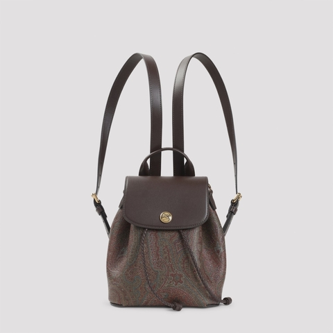 Etro Ladies Backpack. SKU: WP1F0002.AA001 M0019. Color: Marrone. Size: W:18,5cm H:22cm D:10cm. Etro Essential S Arnica Backpack. Etro Essential S Arnica Brown Cotton Backpack. Crafted from the iconic Paisley jacquard fabric with brown leather details, it featured a front flap with a gold-toned branded plaque, a concealed button and drawstring fastening, two leather shoulder straps on the back, and a cowhide lining.