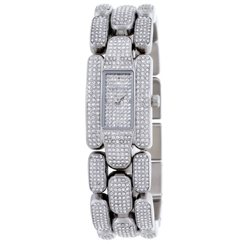 Silver-tone stainless steel case with a silver-tone stainless steel pave bracelet. Fixed silver-tone stainless steel pave bezel. Paved dial with silver-tone hands and index hour markers. Dial Type: Analog. Quartz movement. Scratch resistant mineral crystal. Pull / push crown. Solid case back. Rectangle case shape, case size: 21 mm. Jewelry clasp. Water resistant at 50 meters / 165 feet. Functions: hour, minute. Mini Hally Series. Casual watch style. Michael Kors Mini Hally Pave Quartz Ladies Watch MK4922.