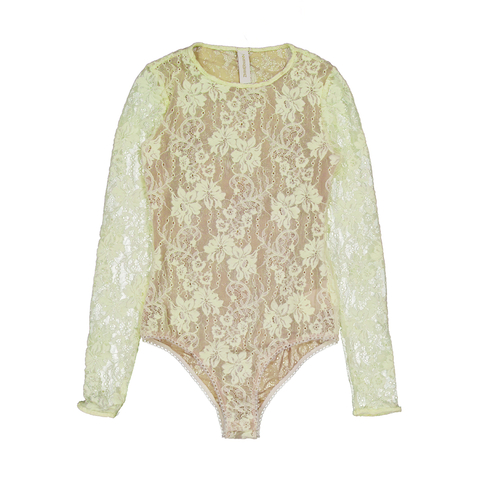 Zimmermann Ladies Tops. Fashion category: Bodysuits. SKU: 8622TR25R. Color: Cream. Zimmermann Stretch Lace Bodysuit. This lace bodysuit is crafted from stretch lace for a flexible, flattering fit. It features mesh lining for comfort, a classic crew neck, long sleeves, and a gusset snap fastening for easy wear. 88% Nylon, 12% Spandex.