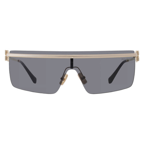 Miu Miu Sunglasses. Series number: MU 50ZS. Color code: 5AK5S0. Shape: Shield. Lens Width: 142 mm. Lens Bridge: 0 mm. Arm Length: 130 mm. 100% UV protection. Non-Polarized. Frame Material: Metal. Frame Color: Gold. Lenses Type: Dark Grey. Rim Style: Rimless. UPC/EAN code: 8056597978989. Miu Miu Dark Grey Shield Ladies Sunglasses MU 50ZS 5AK5S0 142.<br/><br/>Manufacturer's Packaging Included. Packaging Size And Color May Vary.
