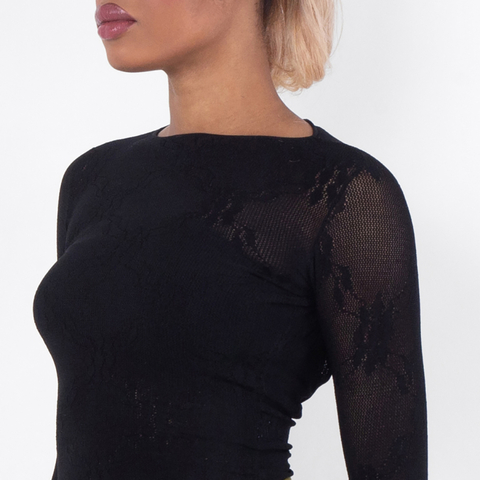 Victoria Beckham Ladies Tops. Fashion category: Bodysuits. SKU: 1225KTP006367A. Color: Black. Victoria Beckham Long-Sleeve Backless Bodysuit. Modern and alluring, this bodysuit features a slash neckline, long sleeves with thumbholes, and a fully exposed back with knitted trim. Crafted in sheer lace pointelle knit, it closes with adjustable snap fastenings for a comfortable fit. Composition: 83% Viscose, 17% Nylon.