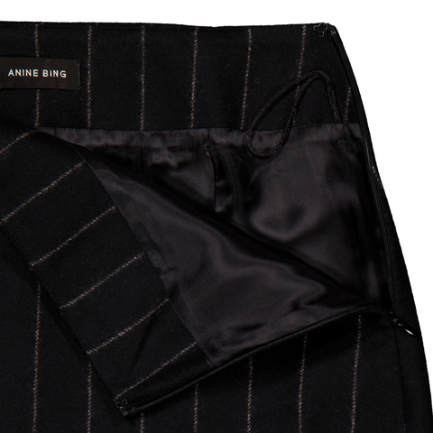 Anine Bing Ladies Bottoms. Fashion category: Skirts. SKU: A-04-10810-DGY1-DARK GREY. Color: Dark Grey. Anine Bing Tierra Mid-Rise Pinstripe Skirt. The Tierra Skirt is crafted from a midweight wool blend with a brushed finish, showcasing an all-over white and grey pinstripe pattern. This feminine staple features a mid-rise, straight fit and a mini-length hemline. Fully lined for comfort, it includes a side-seam zipper for a sleek, polished look. 68% Wool, 27% Nylon, 3% Acrylic, 1% Viscose , 1% Polyester.