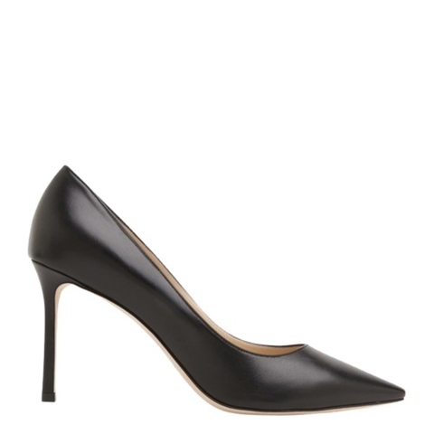 Jimmy Choo Ladies Heels. SKU: J000065651. Color: Black. Jimmy Choo Romy 85 mm Leather Pumps. These Romy leather pumps feature pointed toes and a slip-on style, offering both elegance and comfort. They showcase a classic silhouette and are set on a mid-heel measuring 85mm, with a branded insole for added luxury. <br/><br/><b>Please visit the brand website for sizing information.</b>
