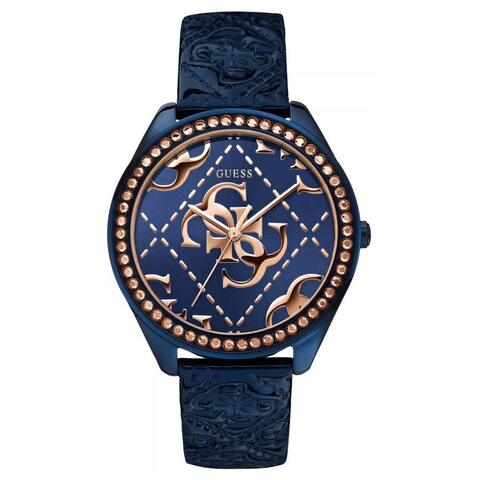Blue stainless steel case with a blue leather strap. Fixed blue stainless steel bezel. Blue dial with rose gold-tone hands. Dial Type: Analog. Quartz movement. Scratch resistant mineral crystal. Solid case back. Round case shape, case size: 44 mm. Band width: 19 mm, band length: 7.5 inches. Buckle clasp. Functions: hour, minute, second. Iconic Series. Fashion watch style. Guess Iconic Quartz Blue Dial Ladies Watch W0473L1.