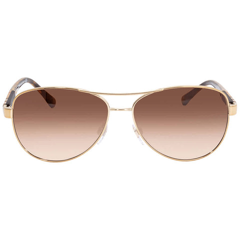 Burberry Sunglasses. Series number: BE3080. Color code: 114513. Color: Gold. Size: 59. Shape: Pilot. Lens Width: 59 mm. Lens Bridge: 14 mm. Arm Length: 135 mm. 100% UV protection. Non-Polarized. Frame Material: Metal. Frame Color: Light Gold. Lenses Type: Brown Gradient. UPC/EAN code: 8053672321005. Burberry Brown Gradient Pilot Unisex Sunglasses BE3080-114513-59.