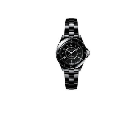 Black ceramic case and bracelet. Uni-directional rotating black ceramic bezel. Black dial with silver-tone hands and Arabic numeral hour markers. Minute markers around the outer rim. Dial Type: Analog. Luminescent hands and markers. Chanel Calibre 12.2 automatic movement. Scratch resistant sapphire crystal. Screw down crown. Transparent see through case back. Round case shape, case size: 33 mm, case thickness: 12.94 mm. Triple-folding buckle clasp. Water resistant at 200 meters / 660 feet. Functions: hour, minute, second. J12 Series. Sport watch style. Watch label: Swiss Made. Chanel J12 Automatic Black Dial Mens Watch H5696.
