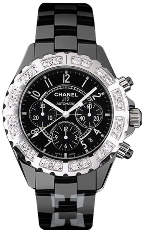 Black ceramic case with a black ceramic bracelet. Diamond accent bezel. Black dial with luminous hands and Arabic hour markers. Minute markers around the outer rim. Dial Type: Analog. Date display appears between the 4 and 5 o'clock position. Chronograph - three sub-dials displaying: 12 hours, 30 minutes, 60 seconds. Automatic movement. Scratch resistant sapphire crystal. Case diameter: 41 mm. Round case shape. Deployment clasp. Water resistant at 200 meters / 660 feet. Functions: hours, minutes, seconds, calendar, chronograph. Sport watch style. Watch label: Swiss Made. Chanel J12 Black Ceramic Diamond Chronograph Automatic Mens Watch H1178.