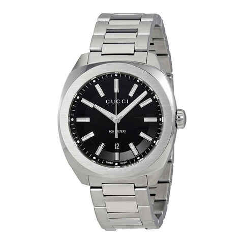 Stainless steel case with a stainless steel bracelet. Fixed stainless steel bezel. Black dial with luminous silver-tone hands and index hour markers. Minute markers around the outer rim. Dial Type: Analog. Luminescent hands and markers. Date display at the 6 o'clock position. Quartz movement. Scratch resistant mineral crystal. Screw down crown. Solid case back. Case size: 40 mm. Case thickness: 8 mm. Cushion case shape. Band width: 23 mm. Band length: 9 inches. Deployment clasp with a push button release. Water resistant at 100 meters / 330 feet. Functions: hour, minute, second. Casual watch style. Watch label: Swiss Made. Gucci GG2570 Black Dial Mens Watch YA142301.