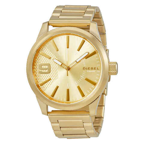 Gold-tone stainless steel case and bracelet. Fixed gold-tone bezel. Gold dial with luminous gold-tone hands and index hour markers. An Arabic numeral appears at the 9 o'clock position. Minute markers around the outer rim. Dial Type: Analog. Quartz movement. Scratch resistant mineral crystal. Pull / push crown. Solid case back. Case dimensions: 53 mm x 46 mm. Case thickness: 10 mm. Round case shape. Band width: 24 mm. Fold over clasp with a safety release. Water resistant at 50 meters / 165 feet. Functions: hour, minute, second. Casual watch style. Diesel Rasp Gold Dial Mens Watch DZ1761.