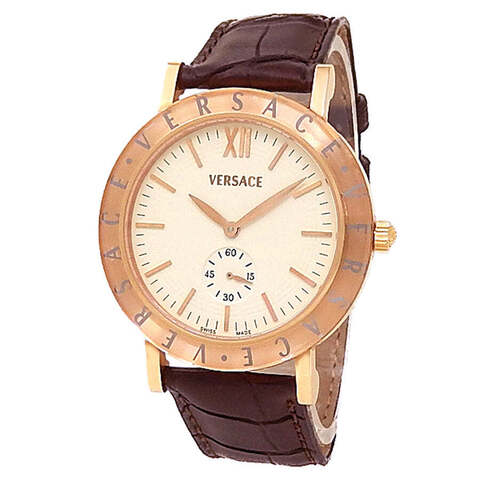 Rose gold-tone 18kt rose gold case with a brown leather strap. Fixed rose gold-tone 18kt rose gold bezel. Grey dial with rose gold-tone hands and index hour markers. Minute markers around the outer rim. Dial Type: Analog. Hand wind movement. Scratch resistant sapphire crystal. Transparent see through case back. Round case shape, case size: 40 mm. Buckle clasp. Water resistant at 30 meters / 100 feet. Functions: hour, minute, second. Versace Series. Dress watch style. Watch label: Swiss Made. Pre-owned Versace Versace Hand Wind Grey Dial Mens Watch 14M00.
