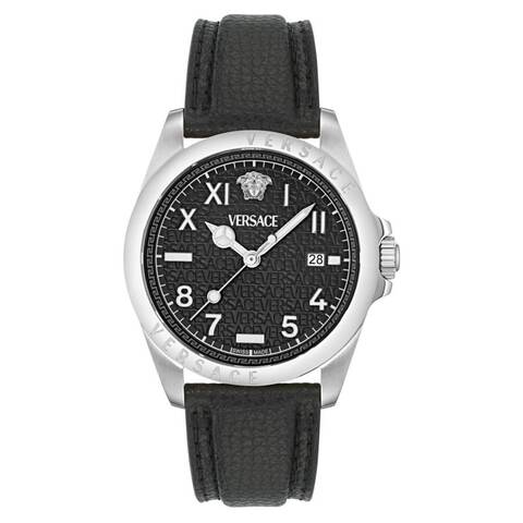Silver-tone stainless steel case with a black leather strap. Fixed silver-tone stainless steel bezel. Black dial with silver-tone hands and Arabic numeral-Roman numeral hour markers. Minute markers around the outer rim. Dial Type: Analog. Date display at the 3 o'clock position. Quartz movement. Scratch resistant sapphire crystal. Pull / push crown. Solid case back. Round case shape, case size: 41 mm. Buckle clasp. Water resistant at 50 meters / 165 feet. Functions: date, hour, minute, second. Anteo Series. Casual watch style. Watch label: Swiss Made. Versace Anteo Quartz Black Dial Mens Watch VE9H00124.
