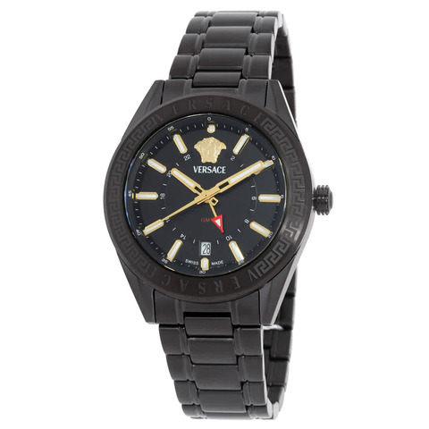 Black IP stainless steel case and bracelet. Fixed black IP stainless steel bezel. Black dial with gold-tone hands and index hour markers. Minute markers around the outer rim. Dial Type: Analog. Luminescent hands and markers. Date display at the 6 o'clock position. Quartz movement. Pull / push crown. Solid case back. Round case shape, case size: 42 mm. Deployment with push button release clasp. Water resistant at 50 meters / 165 feet. Functions: GMT, date, hour, minute, second. V-code Series. Sport watch style. Watch label: Swiss Made. Versace V-Code GMT Quartz Black Dial Mens Watch VEAFA0824.