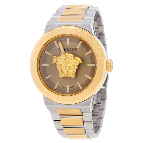 Silver-tone stainless steel case with a two-tone (silver-tone and gold-tone) stainless steel bracelet. Fixed gold-tone stainless steel bezel. Ivory dial with gold-tone hands and index hour markers. Dial Type: Analog. Quartz movement. Scratch resistant sapphire crystal. Pull / push crown. Solid case back. Round case shape, case size: 43 mm. Water resistant at 50 meters / 165 feet. Functions: hour, minute. Medusa Infinite Series. Sport watch style. Watch label: Swiss Made. Versace Medusa Infinite Quartz Mens Watch VE7E00423.
