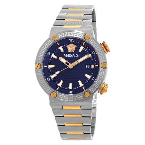 Silver-tone stainless steel case with a two-tone (silver-tone and gold-tone) stainless steel bracelet. Fixed silver-tone stainless steel bezel. Blue dial with gold-tone hands and index hour markers. Minute markers around the outer rim. Dial Type: Analog. Luminescent hands and markers. Date display at the 3 o'clock position. Quartz movement. Scratch resistant sapphire crystal. Solid case back. Round case shape, case size: 43 mm. Water resistant at 100 meters / 330 feet. Functions: date, hour, minute, second. Greca Logo Series. Casual watch style. Watch label: Swiss Made. Versace Greca Logo Quartz Blue Dial Mens Watch VE8G00424.