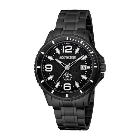 Black stainless steel case and bracelet. Black stainless steel bezel. Black dial with silver-tone hands and index hour markers. Minute markers around the outer rim. Dial Type: Analog. Luminescent hands and markers. Date display at the 3 o'clock position. Quartz movement. Scratch resistant sapphire crystal. Round case shape, case size: 42 mm. Fold over clasp with a safety release. Water resistant at 100 meters / 330 feet. Functions: date, hour, minute, second. Fashion Watch Series. Fashion watch style. Watch label: Swiss Made. Roberto Cavalli Fashion Watch Quartz Black Dial Mens Watch RV1G217M0061.