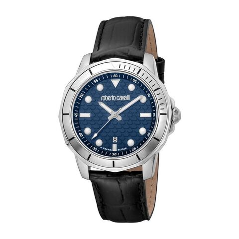 Silver-tone stainless steel case with a black leather strap. Silver-tone stainless steel bezel. Blue dial with silver-tone hands and index hour markers. Minute markers around the outer rim. Dial Type: Analog. Luminescent hands and markers. Date display at the 6 o'clock position. Quartz movement. Scratch resistant sapphire crystal. Round case shape, case size: 42 mm. Water resistant at 100 meters / 330 feet. Functions: date, hour, minute, second. Fashion Watch Series. Fashion watch style. Watch label: Swiss Made. Roberto Cavalli Fashion Watch Quartz Blue Dial Mens Watch RV1G159L0011.