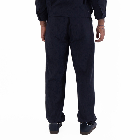 Emporio Armani Mens Bottoms. SKU: EM001145-AF13674-UB118. Color: Navy Blue. Emporio Armani Seersucker Nylon Trousers. Crafted from lightweight seersucker nylon, these Emporio Armani trousers combine urban style with signature comfort. The elasticated back waist and internal drawstring ensure a perfect fit, while the dynamic crinkled texture of the seersucker fabric adds effortless summer appeal. Details: Featherweight seersucker texture. Waist with belt loops, elasticated back, and internal drawstring. Front zip, hook, and back button closure. Side pockets. Back double welt pockets. Material: 100% nylon (fabric), lining 65% polyester.