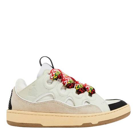 Lanvin Ladies Sneakers. SKU: FW-SKDK02-DRA2-A21-WHITE. Color: White. Shoe Style: Low Top. Lanvin Womens Curb Sneakers. These 90s-inspired low-top sneakers feature exaggerated proportions and a mix of nappa calfskin, suede, and mesh. They are detailed with a quilted tongue bearing the Lanvin label and embossed Mother and Child logo, metallic eyelets, and double waxed herringbone laces for a refined, retro look. <br/><br/><b>Please visit the brand website for sizing information.</b>