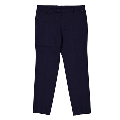 Hugo Boss Mens Bottoms. Fashion category: Pants & Leggings. SKU: 50522678-404. Color: Dark Blue. Hugo Boss Slim-Fit Wool-Blend Trousers. Made from a luxurious silk and stretch wool blend, these trousers feature an off-center buttoned closure with a zip fly, a waistband with belt loops, and a slim fit. They are further enhanced with a subtle micro graphic pattern for added style. 85% wool 9% nylon 4% silk 2% spandex
