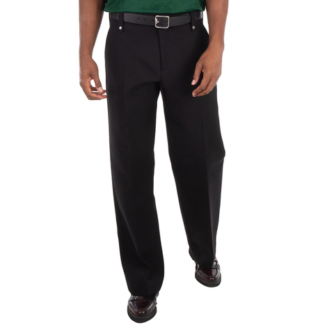 Burberry Mens Bottoms. Fashion category: Pants & Leggings. SKU: 8077652. Color: Black. Burberry Wool Blend Tailored Trousers. A pair of wool blend tailored trousers featuring a relaxed fit, designed with press-stud belt loops.54% polyester, 46% wool. Made in Italy.