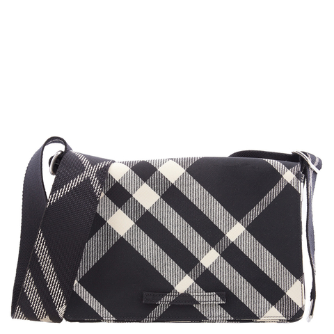 Burberry Mens Crossbody. SKU: 8095015. Material: Cotton;Polyester. Color: Black/Calico. Size: W:25cm x H:16cm x D:8cm. Burberry Check Trench Cotton-Blend Crossbody Bag. This crossbody bag features a cotton blend fabric with the iconic Burberry Check pattern, adorned with the signature Equestrian Knight motif, an adjustable shoulder strap, a foldover top with a magnetic fastening, and a cotton blend lining. 65% Polyester, 35% Cotton. Made in Italy.