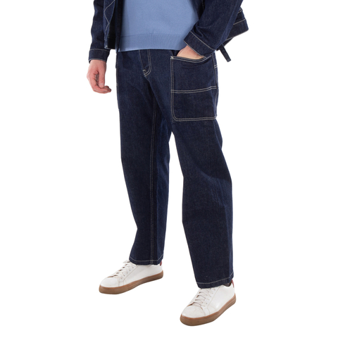 Kenzo Mens Bottoms. Fashion category: Pants & Leggings. SKU: FE65DP4086A1.DM. Color: Rinse Blue Denim. Kenzo Logo-Patch Wide Leg Denim Pants. This pants feature cotton denim with contrast stitching, belt loops, classic five pockets, rivet detailing, two side patch pockets, a full-length design, a logo patch on the rear, a wide leg, and a concealed fly with a button fastening. 100% Cotton. Made in Tunisia.