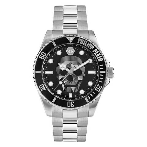Silver-tone stainless steel case and bracelet. Uni-directional rotating black stainless steel bezel. Black dial with silver-tone hands and index hour markers. Minute markers around the outer rim. Dial Type: Analog. Luminescent hands and markers. Quartz movement. Scratch resistant mineral crystal. Solid case back. Round case shape, case size: 44 mm, case thickness: 12 mm. Water resistant at 50 meters / 165 feet. Functions: hour, minute, second. The Skull Diver Series. Casual watch style. Philipp Plein The Skull Diver Quartz Black Dial Mens Watch PWOAA0522.