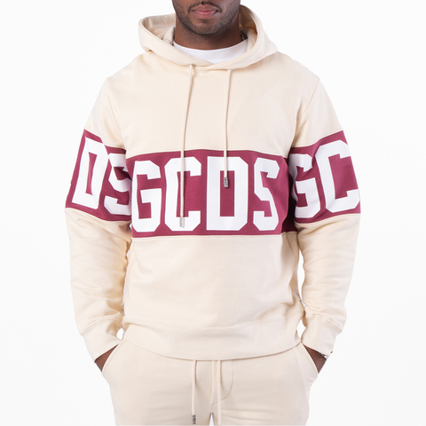 GCDS Mens Tops. Fashion category: Hoodies & Sweatshirts. SKU: CC94M100013-15. Color: Bordeaux. GCDS Logo Band Sweatshirt. Bold and unmistakably GCDS, this sweatshirt is crafted from loop-back cotton jersey and features a striking inlaid maxi logo band running down both sides and sleeves. Designed in a loose fit, its finished with a drawstring hood, micro-ribbed cuffs and hem, and the brands signature side flag label with metal logo detail. Made in Italy.