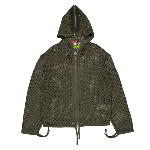 Kenzo Mens Tops. Fashion category: Hoodies & Sweatshirts. SKU: FF55CA7213CI-50. Color: Khaki. Kenzo Cotton Mesh Knitted Hooded Sweatshirt. This sweathisrt is crafted from cotton mesh and features an embroidered, zip-up knitted hooded design. It includes a two-way zip closure, a distinctive zipped hood, and thick drawstrings. The look is finished with an embroidered 'KENZO Paris' label on the back, just below the neckline. 100% Cotton. Made in China.