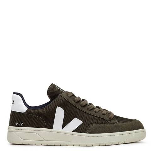 Veja Mens Sneakers. SKU: XD0102820B. Color: Olive-White. Veja V-12 Vegan B-Mesh Olive White Sneakers. The Veja V-12 Vegan B-Mesh sneakers in Olive White are sustainably crafted low-top trainers featuring a breathable olive green B-Mesh upper made from recycled plastic bottles. Theyre accented with suede-like overlays and a bold white V logo on the side, along with a contrasting white heel tab branded with VEJA. Set on a sturdy off-white rubber sole, these sneakers offer a clean, modern aesthetic with eco-conscious design. Made in Brazil. <br/><br/><b>Please visit the brand website for sizing information.</b>
