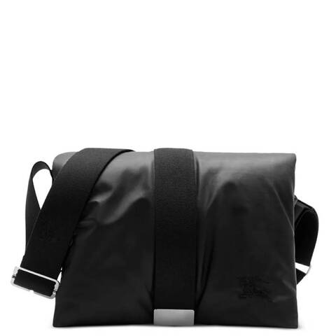 Burberry Mens Crossbody. SKU: 8083435. Color: Black. Burberry Padded Foldover-Top Messenger Bag. The Burberry 'Pillow' shoulder bag features a snap fastening and showcases graphic embroidery with the brand's Equestrian Knight motif. It is detailed with silver-tone metal hardware, an adjustable shoulder strap, and one internal compartment with a zip pocket. 100% Clalf Leather, Made in Italy.