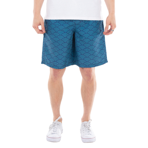 Kenzo Mens Swim. Fashion category: Swimsuits. SKU: FE55BA3019B1-73. Color: Blue. Kenzo Drawstring Waistband Swim Shorts. This swim shorts feature a Seigaiha all-over print, an elasticated drawstring waistband, two side slit pockets, a rear flap pocket, eyelet detailing, are unlined, and have a front touch-strap fastening. Polyester 100%.