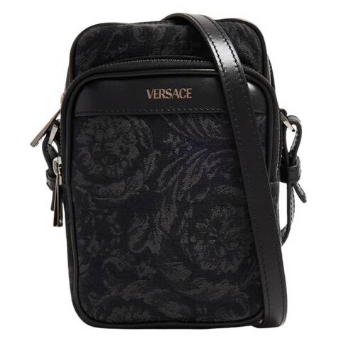 Versace Mens Crossbody. SKU: 1013531-1A09321_2BM0E. Color: Black/Ruthenium. Size: L 7.48 X H 5.12 X W 2.95. Versace Barocco Jacquard Crossbody Bag. This crossbody bag showcases the iconic Barocco print in a jacquard pattern, accented with leather trims. It features a detachable, adjustable shoulder strap and is finished with a front zipped pocket for added convenience. Material: 53% Nylon, 38% Cotton, 6% Polyester, 3% Acrylic. Made in Italy.