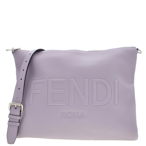 Fendi Mens Messenger. SKU: 7VA604-AMAC-F1MLH. Color: Dusty Lavander/P. Size: H 13.78 x W 16.93. Fendi After Handbag With Fendi Roma. This bag features a pebbled texture, an embossed logo on the front, and an FF logo plaque. It includes silver-tone hardware, a top zip fastening, and an adjustable, detachable shoulder strap. The main compartment is complemented by an internal logo patch. 100% Calfskin.