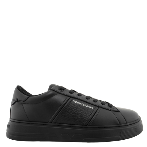Emporio Armani Mens Sneakers. SKU: X4X570-XN840-K001. Color: Black/Black. Emporio Armani Leather Sneakers With Logo Detail. Calfskin sneakers featuring a contrasting side logo and screen-printed branding on the tongue and heel tab. The streamlined silhouette draws inspiration from classic 90s basketball styles, offering everyday comfort with a modern edge. Calfskin upper with contrast logo. Rounded toe. EVA rubber sole. Logo detailing at tongue and back tab. Lining: polyester; insole: polyester; sole: ethylene-vinyl acetate. <br/><br/><b>Please visit the brand website for sizing information.</b>