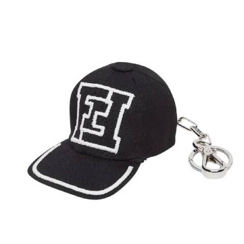 Fendi Mens Keychains. SKU: 7AS185-AP1Q-F1DG7. Color: Black/ White/ Palladium. Fendi Hat Charm Keychain. This keychain features a hat with an FF motif on the front, accented with silver metal hardware. Made in Italy.