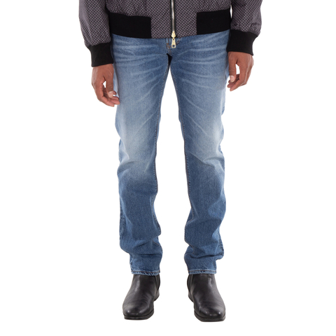 Emporio Armani Mens Bottoms. Fashion category: Jeans & Denim. SKU: 6D1J06-1D97Z-0942. Color: Denim Blu Md. Emporio Armani Veining J06 Slim-Fit Denim Jeans. These stretch cotton denim jeans feature a skinny leg, low-rise waist, zip and button closure, and a slim fit, with stone-washed fabric that showcases sophisticated front veining for a worn look, while offering a five-pocket style, a coin pocket with logo plate, and leather logo and eagle logo plates. 99% cotton, 1% elastane.