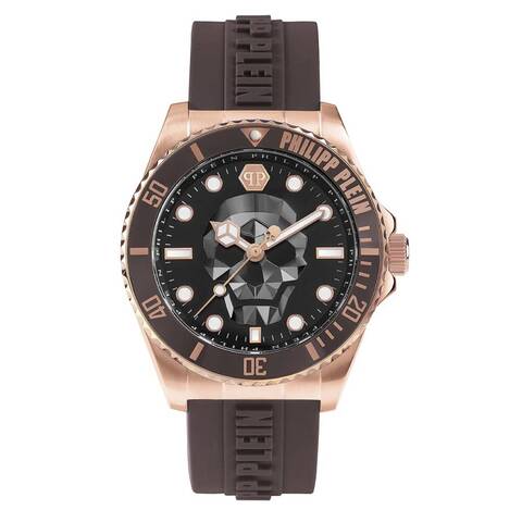 Rose gold-tone stainless steel case with a brown silicone strap. Uni-directional rotating brown stainless steel bezel. Black dial with rose gold-tone hands and index hour markers. Minute markers around the outer rim. Dial Type: Analog. Luminescent hands and markers. Quartz movement. Scratch resistant mineral crystal. Solid case back. Round case shape, case size: 44 mm, case thickness: 12 mm. Buckle clasp. Water resistant at 50 meters / 165 feet. Functions: hour, minute, second. The Skull Diver Series. Casual watch style. Philipp Plein The Skull Diver Quartz Black Dial Mens Watch PWOAA0322.