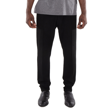 Emporio Armani Mens Bottoms. Fashion category: Pants & Leggings. SKU: EM000440-TE11235-UC001. Color: Nero Carbone. Emporio Armani Knitted Cotton Blend Trousers. This pair of trousers features a buttoned fastening, zip fly, elasticated waistband with belt loops, seam detailing, side pockets, and a tapered leg.