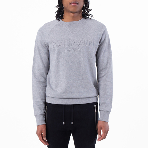 Balmain Mens Tops. Fashion category: Hoodies & Sweatshirts. SKU: YH1JQ005BB20-9UB. Color: Ub Gris Chine. Balmain Paris Embossed Sweatshirt. This sweatshirt features a classic round neck and long sleeves, finished with ribbed edging for a comfortable fit. A contrasting Balmain Paris logo embossed on the front adds a bold, signature touch to the casual design. 100% Cotton.