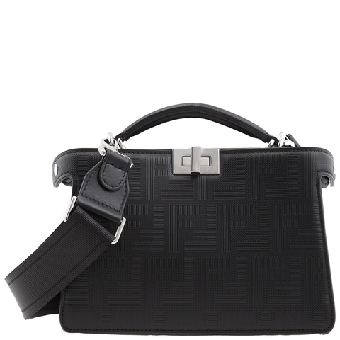 Fendi Mens Crossbody. SKU: 7VA582-AP1T-F0GXN. Color: Black/Palladio. Size: H: 14.5 cm D: 6 cm W: 23 cm. Fendi Peekaboo ISeeU Leather Crossbody Bag. This bag is crafted from Shadow leather with a striped texture featuring the FF motif. The front is adorned with a signature twist lock, while the back includes a zipper fastening, a tone-on-tone inner leather lining, two compartments separated by a rigid partition, a card slot, and palladium-finish metal hardware. This bag can be carried by hand or over the shoulder, with its handle or the adjustable, detachable shoulder strap with logo lettering. 100% calf leather, inside: 100% calf leather, 90% polyester, 10% polyurethane. Made in Italy.