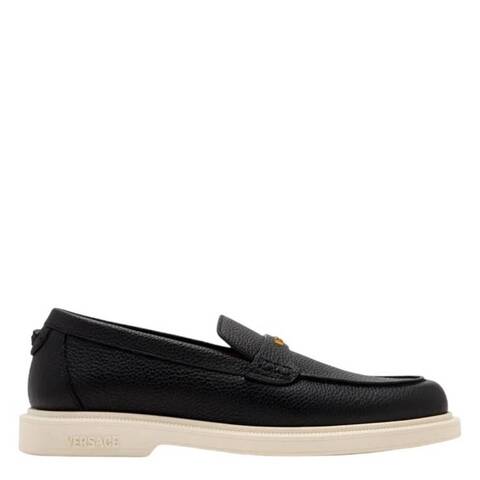 Versace Mens Loafers. SKU: 1017591-1A12647. Color: Black. Versace Mens Black Giuliano Loafers. These loafers are crafted from grainy leather and set on comfortable soles for effortless wear. The design features a classic round toe and a penny strap detailed with an injected Versace logo lettering, complemented by the iconic Medusa motif for a signature finish. Outer: 100% Calf leather. Made in Italy. <br/><br/><b>Please visit the brand website for sizing information.</b>
