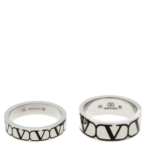 Valentino Mens Rings. SKU: 5Y2J0S08GMUP0N. Color: Palladium/Black. Ring style: Band. Valentino Garavani Toile Iconographe Ring Set. Valentino Garavani ring set, crafted in Italy from premium metal. The design features the brands iconic black VLogo pattern set against a sleek silver-tone finish, creating a bold and contemporary look. Made In Italy.