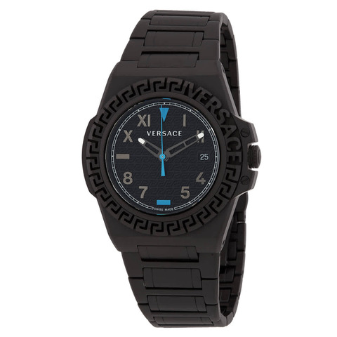 Black IP stainless steel case and bracelet. Fixed black IP stainless steel bezel. Black dial with black hands and Arabic numeral-Roman numeral hour markers. Minute markers around the outer rim. Dial Type: Analog. Date display at the 3 o'clock position. Quartz movement. Scratch resistant sapphire crystal. Pull / push crown. Solid case back. Round case shape, case size: 44 mm. Deployment with push button release clasp. Water resistant at 50 meters / 165 feet. Functions: date, hour, minute, second. Greca Reaction Series. Casual watch style. Watch label: Swiss Made. Versace Greca Reaction Quartz Black Dial Mens Watch VE3I00622.