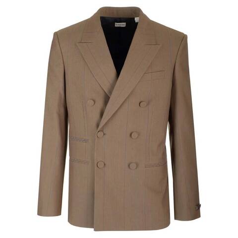 Burberry Mens Outerwear. Fashion category: Coats & Jackets. SKU: 8088409. Color: Dusk. Burberry Lee Double-Breasted Wool Blazer. This wool blazer showcases a sophisticated design with peak lapels and a double-breasted button fastening. It features long sleeves with buttoned cuffs and a straight hem, offering a polished and timeless silhouette. Wool 100%. Made in Italy.