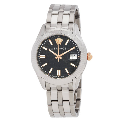 Silver-tone stainless steel case and bracelet. Fixed silver-tone stainless steel bezel. Black dial with gold-tone hands and index hour markers. Medusa head marks the 12 o'clock position. Minute markers around the outer rim. Dial Type: Analog. Luminescent hands and markers. Date display at the 3 o'clock position. Quartz movement. Scratch resistant sapphire crystal. Pull / push crown. Solid case back. Round case shape, case size: 41 mm. Deployment with push button release clasp. Water resistant at 50 meters / 165 feet. Functions: date, hour, minute, second. Greca Time Series. Casual watch style. Watch label: Swiss Made. Versace Greca Time Quartz Black Dial Mens Watch VE3K00322.
