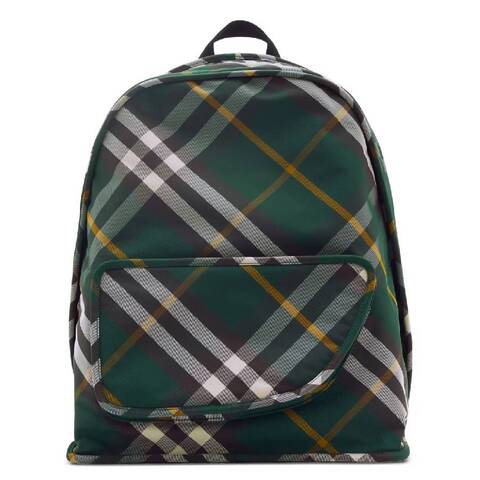 Burberry Mens Backpack. SKU: 8080679. Color: Green. Size: W: 39cm H: 46cm D: 21cm. Burberry Shield Check Pattern Woven Backpack. This backpack features an interwoven design with a check pattern, signature Web detailing, silver-tone hardwarea two-way zip fastening, two adjustable shoulder straps, a loop handle, and a front shield shaped pouch pocket, all with a full lining. 100% Polyamide, Back panel: 100% polyester. Made in Italy.