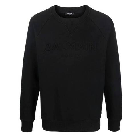 Balmain Mens Tops. Fashion category: Cardigans & Sweaters. SKU: XH1JQ005BB20-0PA. Color: Black. Balmain Logo Embossed Cotton Sweatshirt. This sweatshirt features a front tone-on-tone design, ribbed cuffs and hem, a round neck, long sleeves, and an embossed logo, combining simplicity and elegance for a modern, refined street-luxe look. 100% Cotton.